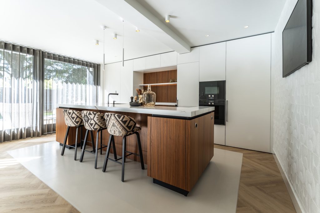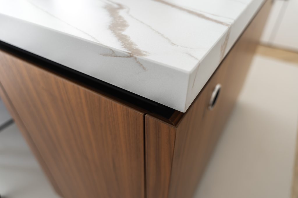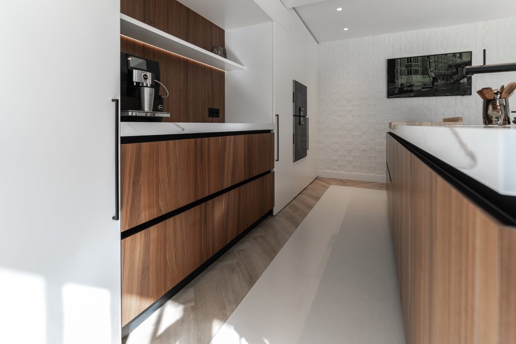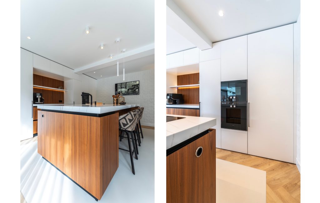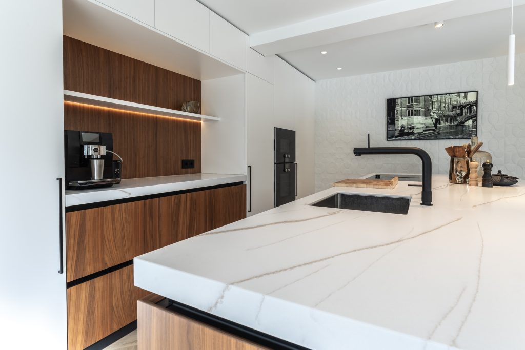 De eiland fronten zijn gemaakt van Noce Italiana evenals de rugwand in de nis.