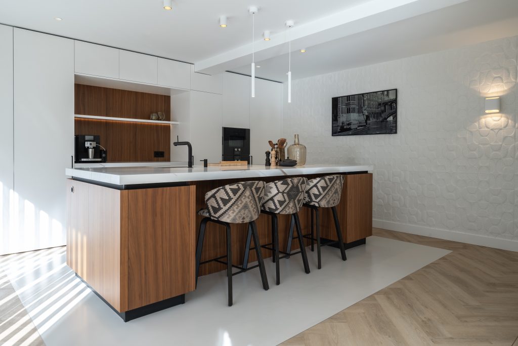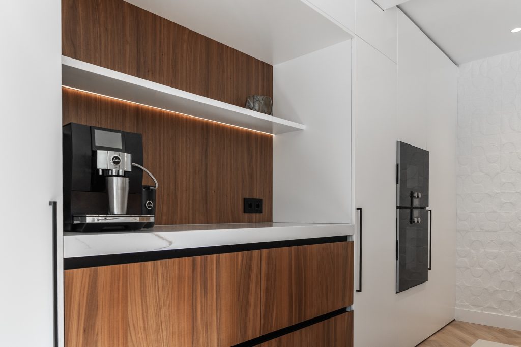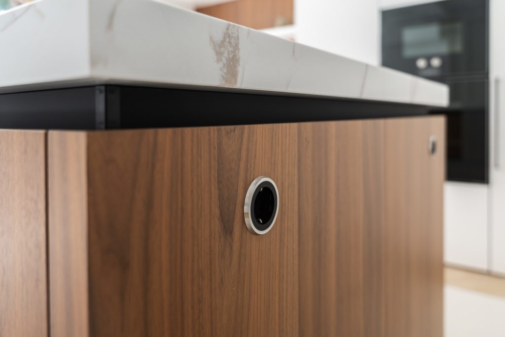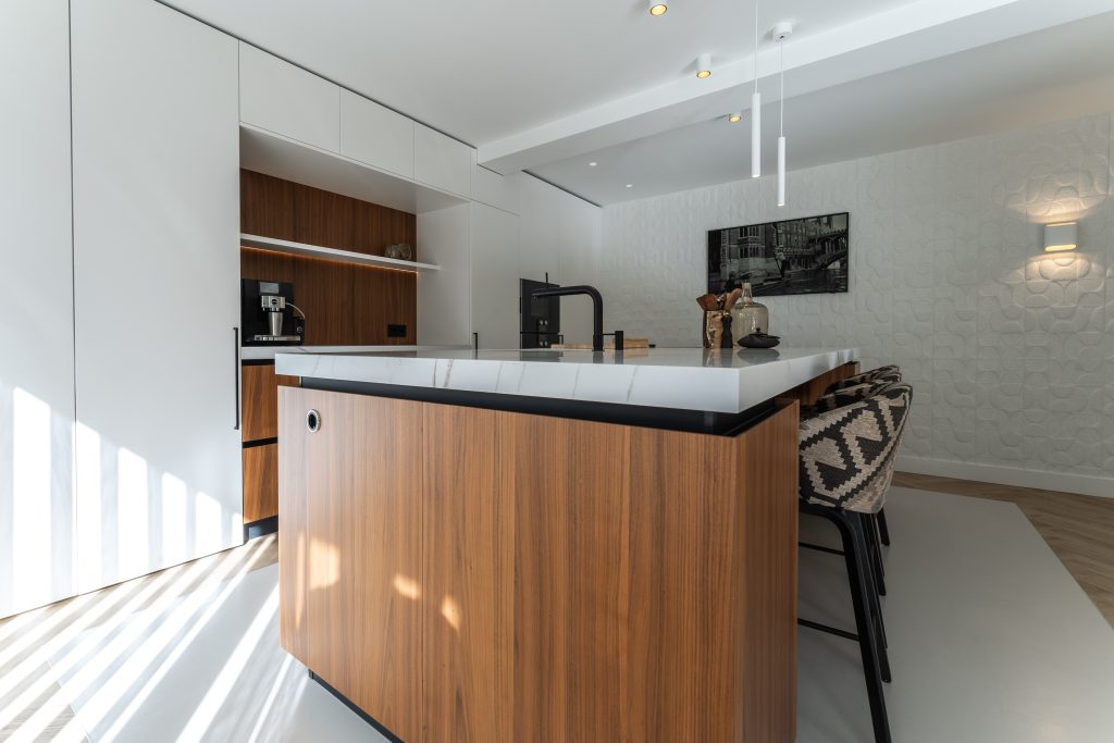 De eiland fronten zijn gemaakt van Noce Italiana evenals de rugwand in de nis.