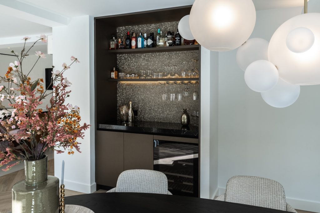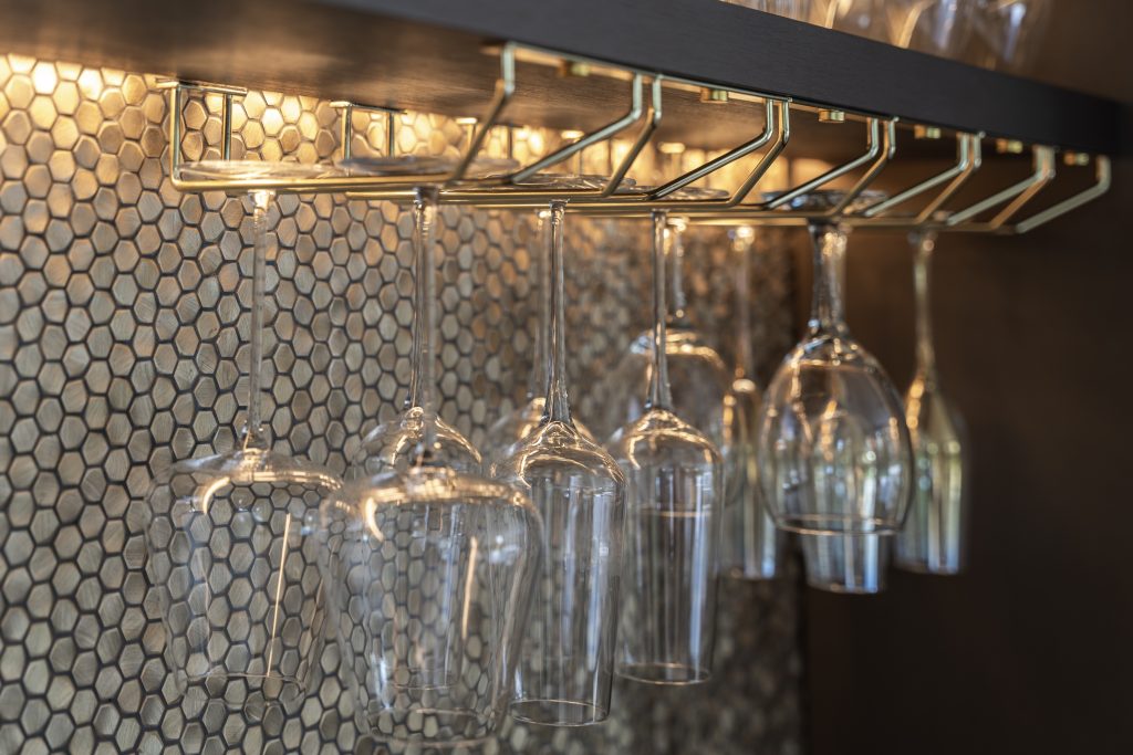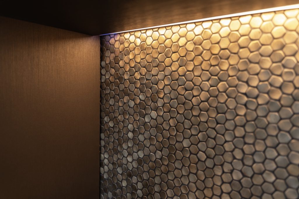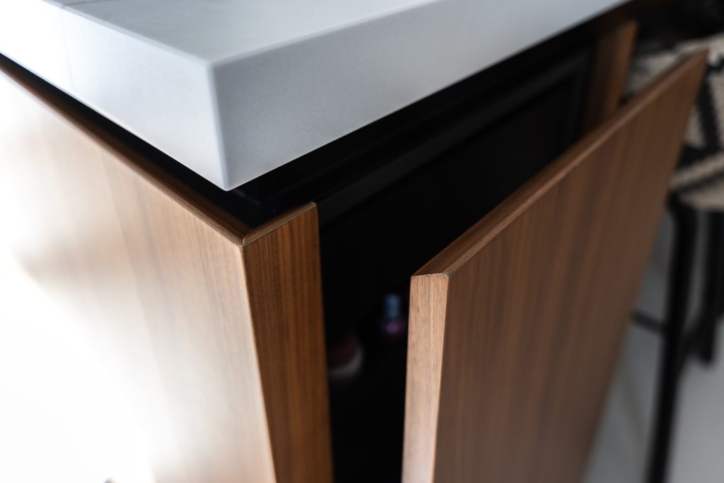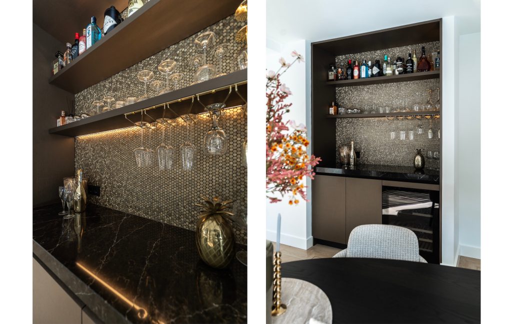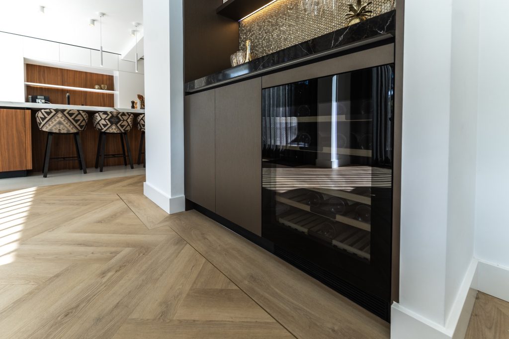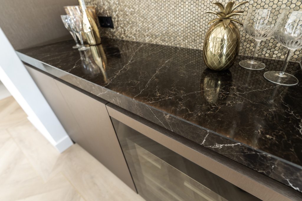De luxe wijnhoek is uitgevoerd in mat bronzo panelen met een Luxury Stone afzetblad. Dit maakt het geheel meer dan compleet!