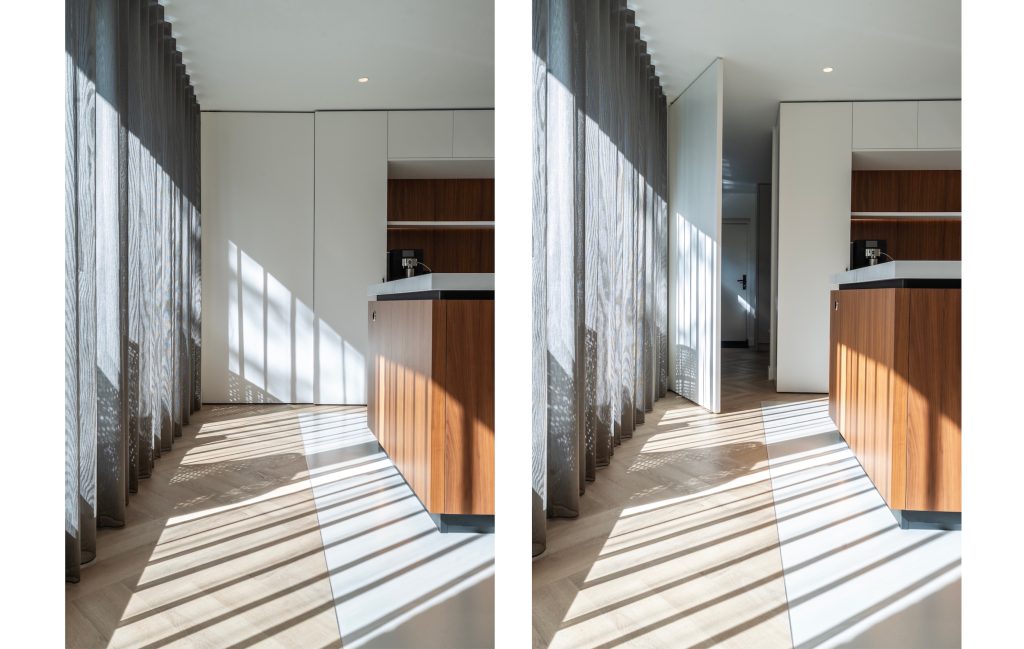 In deze Linea Quattro keuken zien we een hoge kastenwand off white mat lak met “walk through” deur naar de bijkeuken.